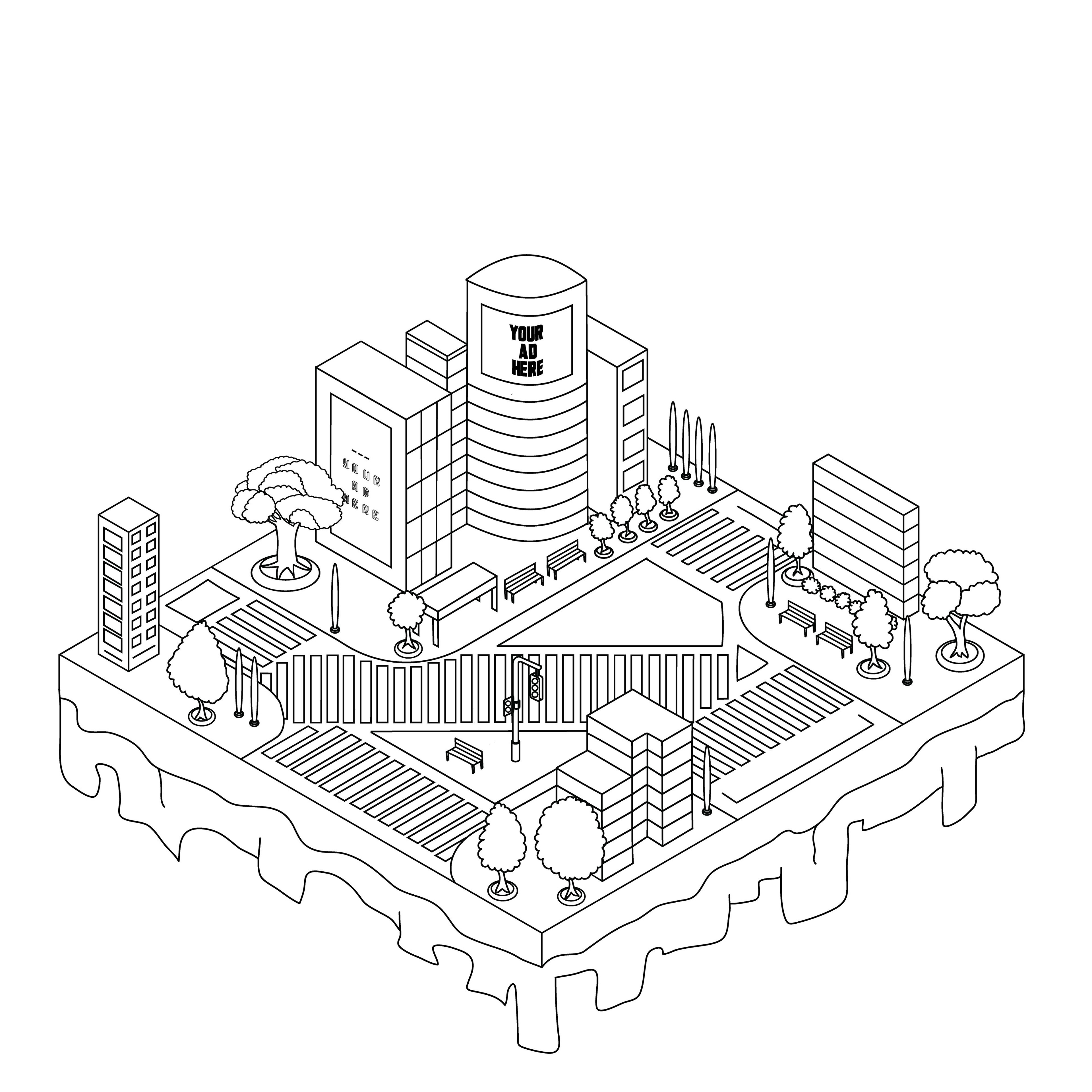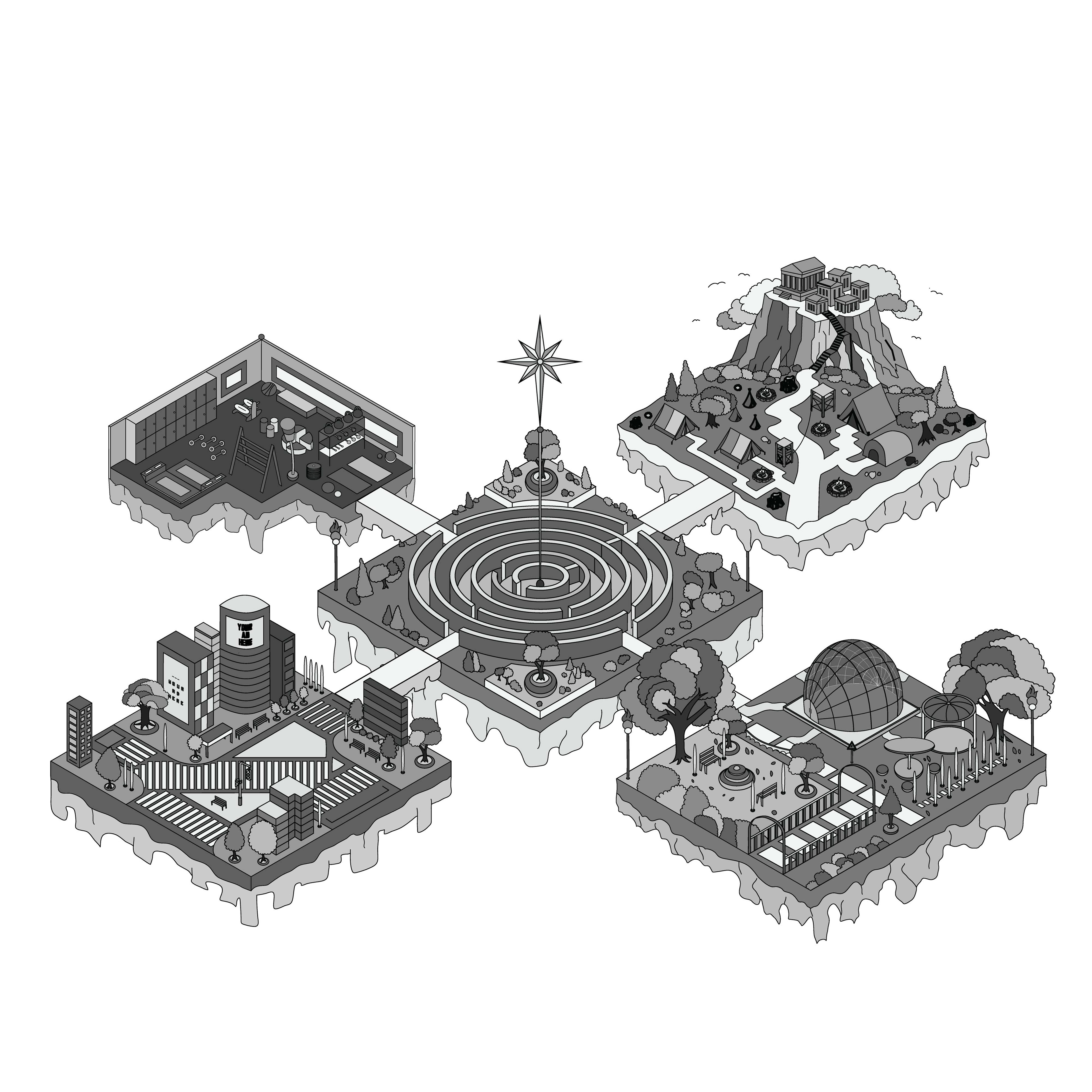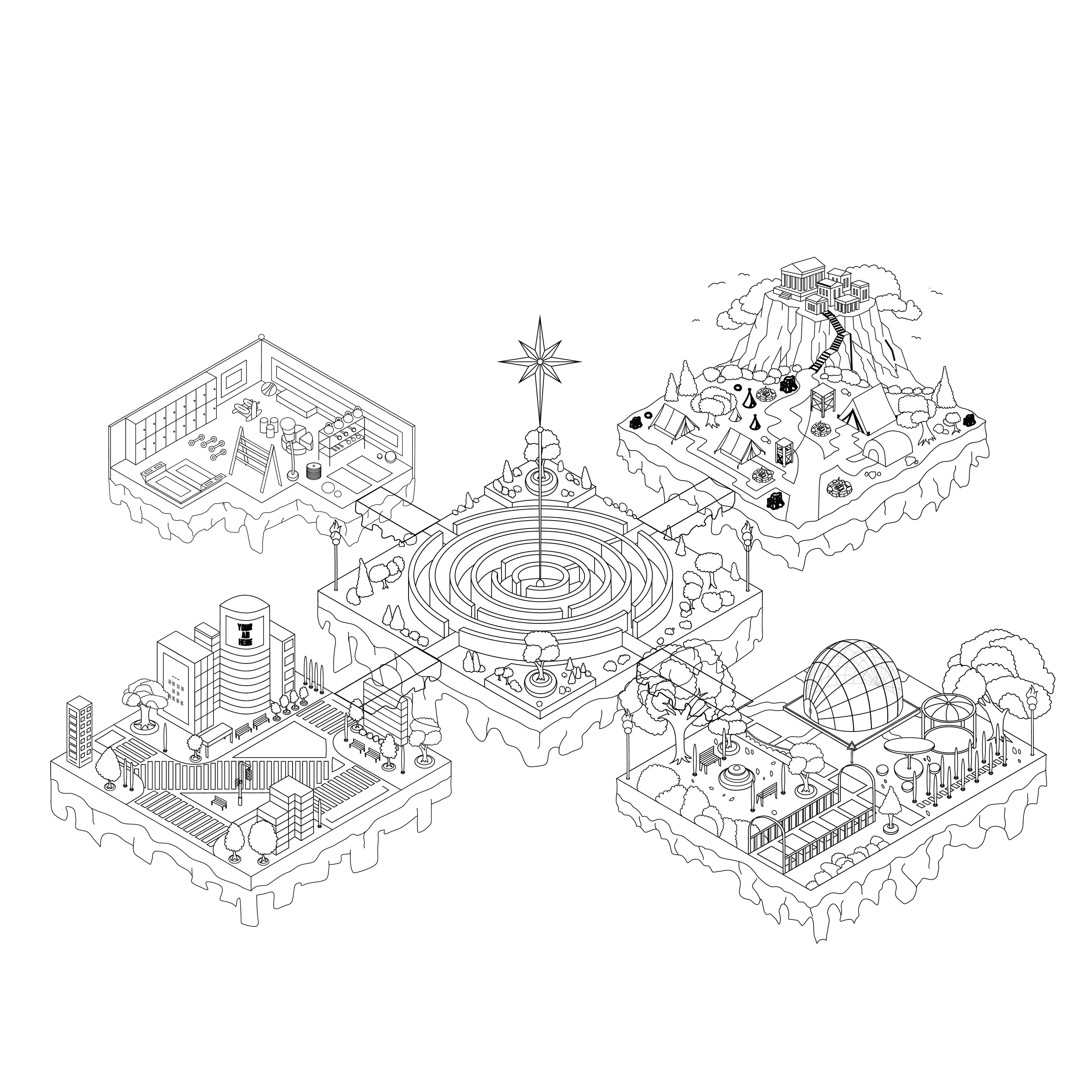 Below are the rough sketches of each geolocation shown in an isometric perspective, followed by clean lineart versions. Gradual changes were made throughout the process to achieve more refined and visually striking results.