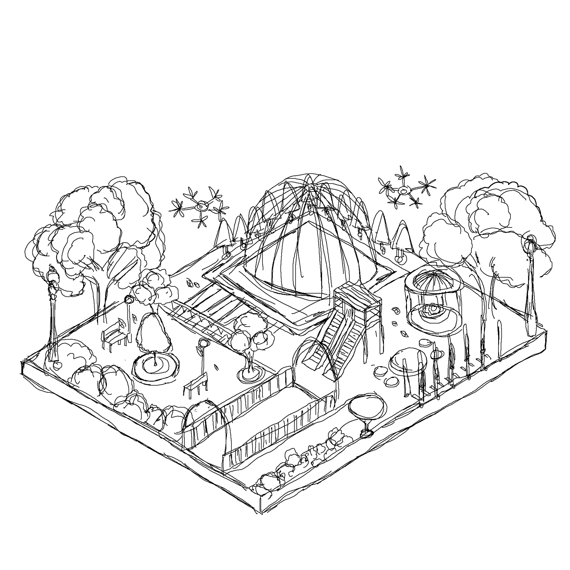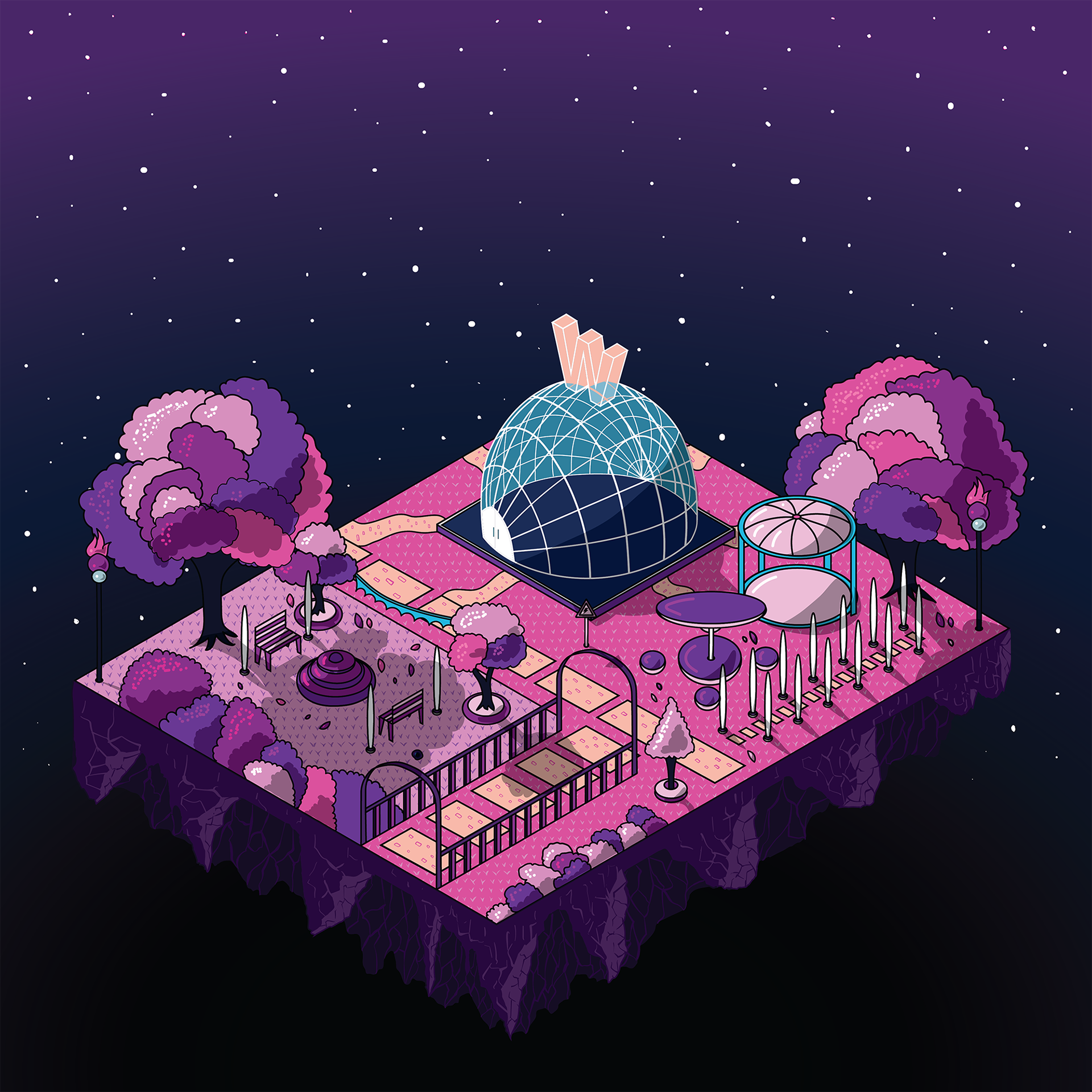 The Park - Featuring a large futuristic dome. A prominent "W" floats above it, symbolizing that this is part of the Walkers Universe.